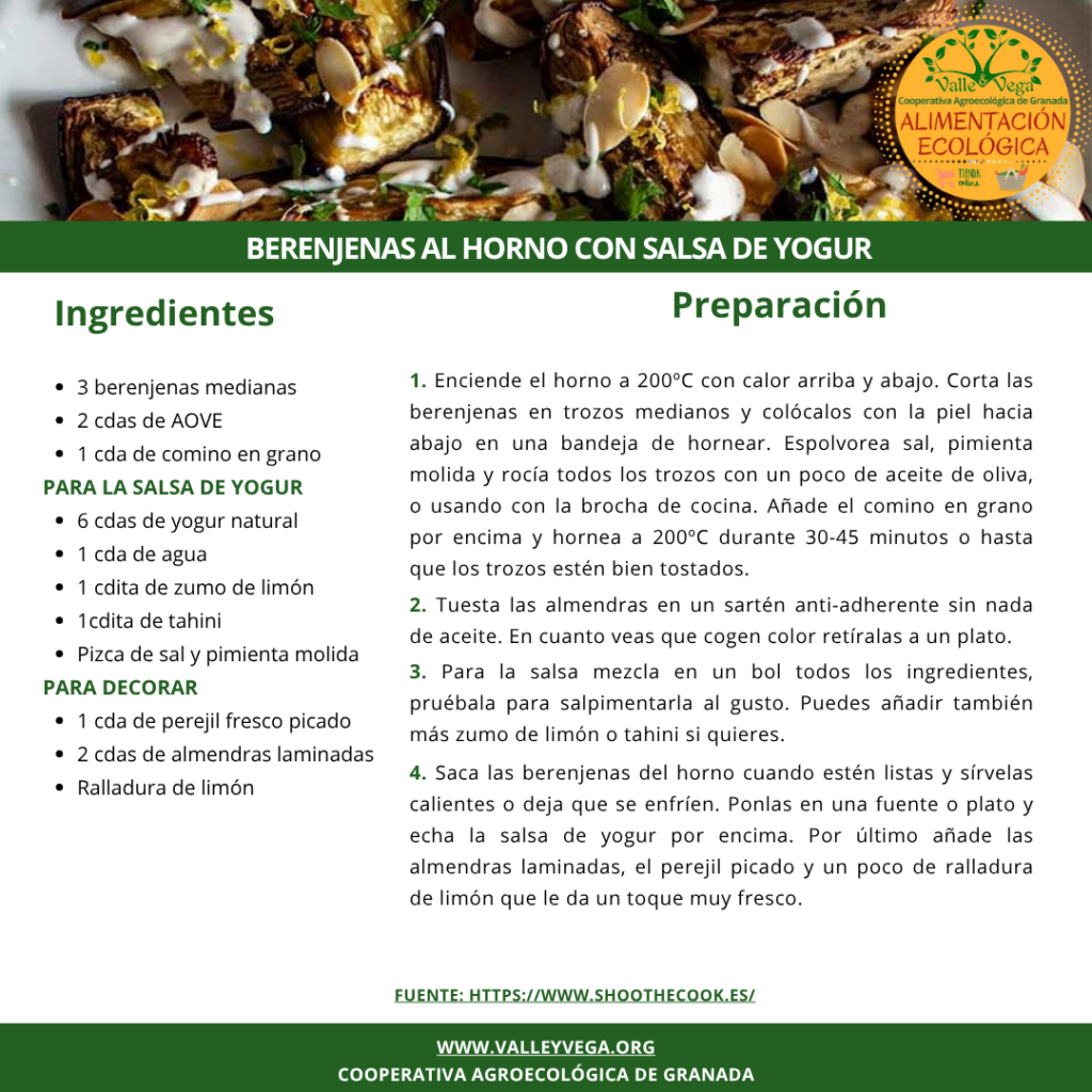 Accede directamente a los ingredientes que necesitas: Berenjena negra (Sole y Raúl – Santa Fe), yogur natural, comino en grano, limón, almendra pepita (Juanan – Monachil), tahini, perejil fresco, sal marina, pimienta negra molida y aceite de oliva virgen extra (Juan Antonio – Monachil).