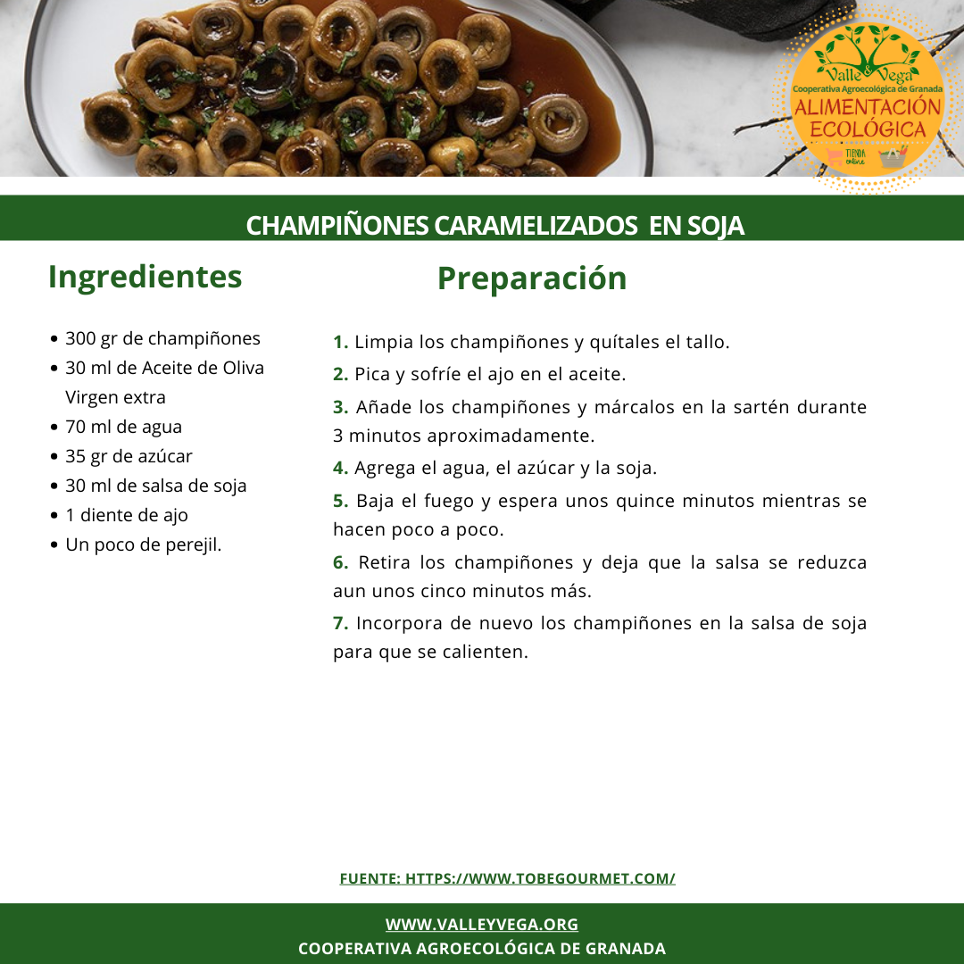 Accede directamente a los ingredientes que necesitas: Champiñón portobello, perejil fresco (Sole y Raúl – Santa Fe), azúcar blanca, salsa de soja, ajo, sal marina y aceite de oliva virgen extra (Juan Antonio – Monachil).