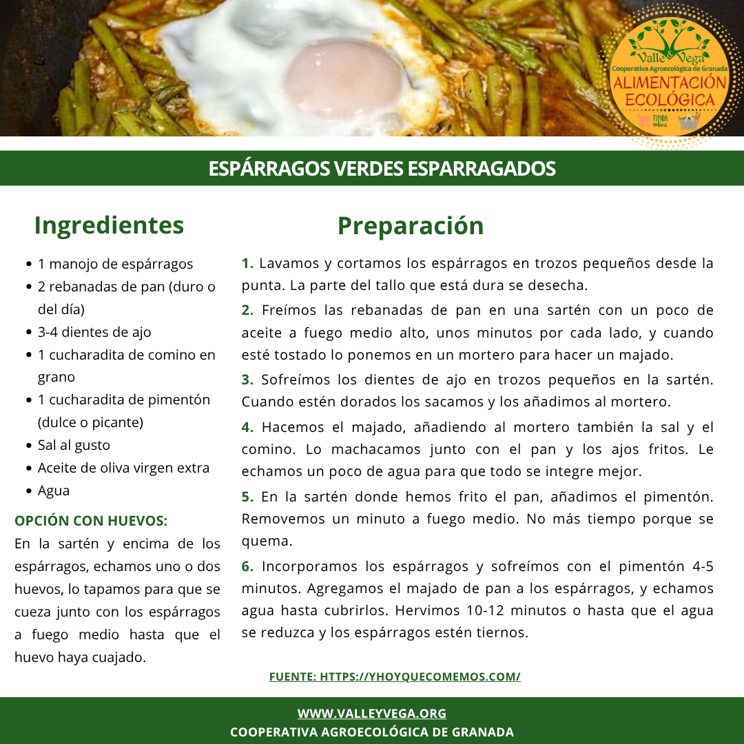 Accede directamente a los ingredientes que necesitas: Espárragos, ajo morado, pan (Panadería Buenas Migas – Nigüelas), huevos, pimentón dulce o picante, comino en grano, sal marina y aceite de oliva virgen extra (Juan Antonio – Monachil).