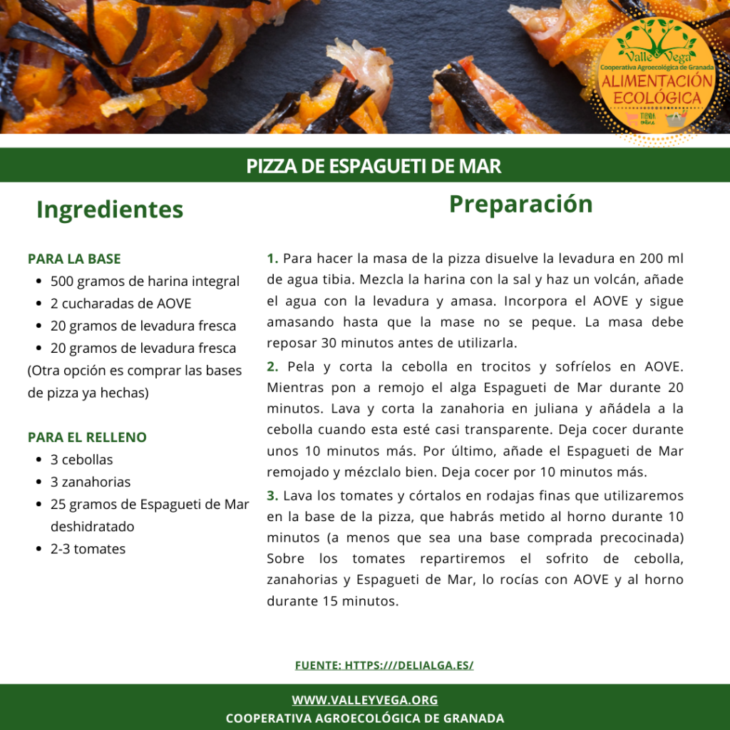 Accede directamente a los ingredientes que necesitas: harina integral de trigo o bases de pizza de trigo integral precocidas (Buenas Migas – Nigüelas), cebolla, zanahorias manojo (Sole y Raúl – Santa Fe), espagueti de mar (algas deshidratadas)tomate perasal marina y  aceite de oliva virgen extra (Juan Antonio – Monachil).