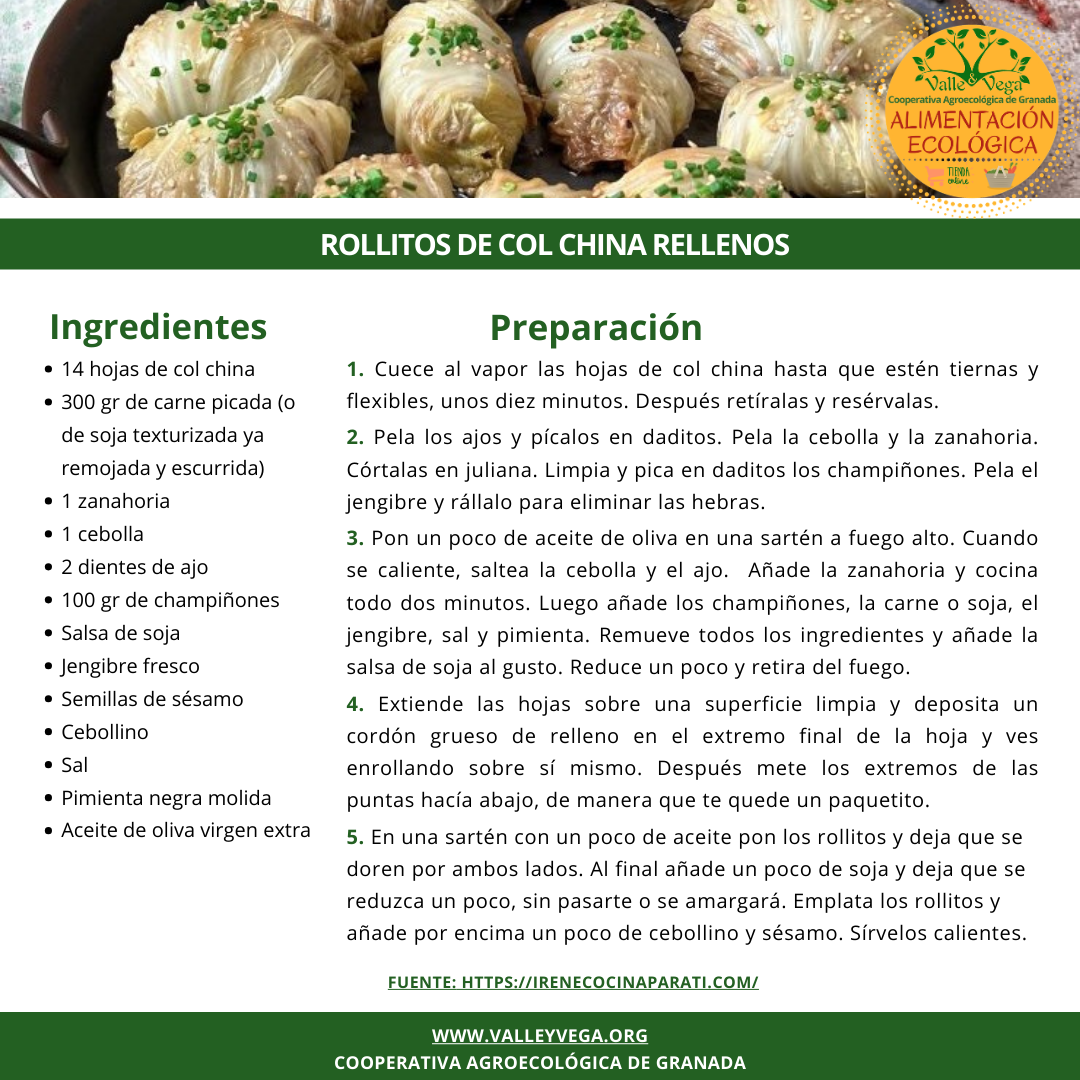 Accede directamente a los ingredientes que necesitas: Col china o col de Milán (Sole y Raúl – Santa Fe), soja texturizada, zanahoria, cebolla, ajo morado, champiñón portobello, salsa de soja, jengibre fresco, pimienta negra molida, semillas de sésamo, sal marina y aceite de oliva virgen extra (Juan Antonio – Monachil).